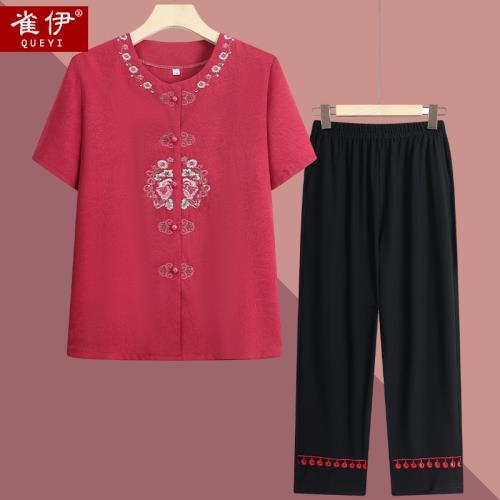 中老年人夏裝女襯衫老太太短袖開衫衣奶奶唐裝喜慶紅色襯衣兩件套