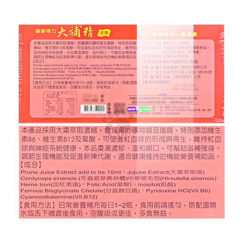 中文品名:藥聯得力大補精