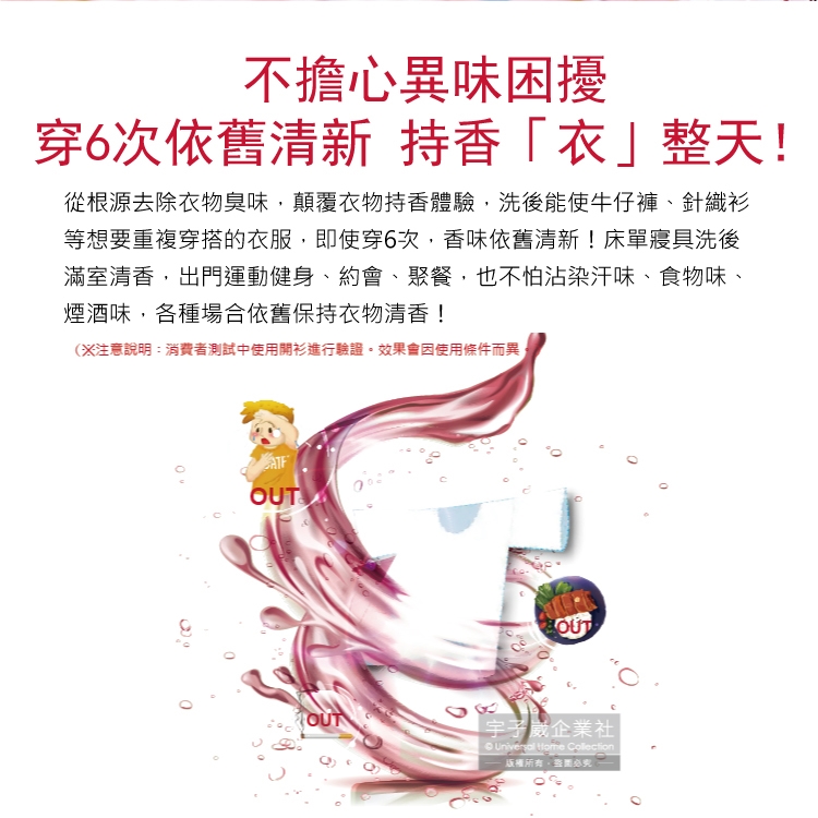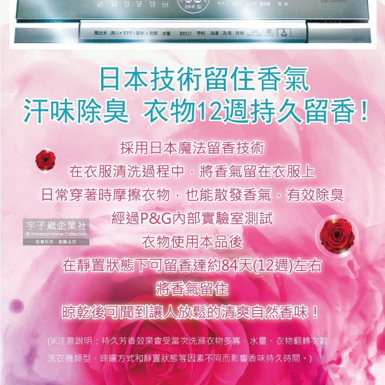 (9)持久芳香效果會受當次洗滌衣物多寡、水量、衣物翻轉次數、洗衣機類型、晾曬方式和靜置狀態等因素不同而影響香味持久時間。