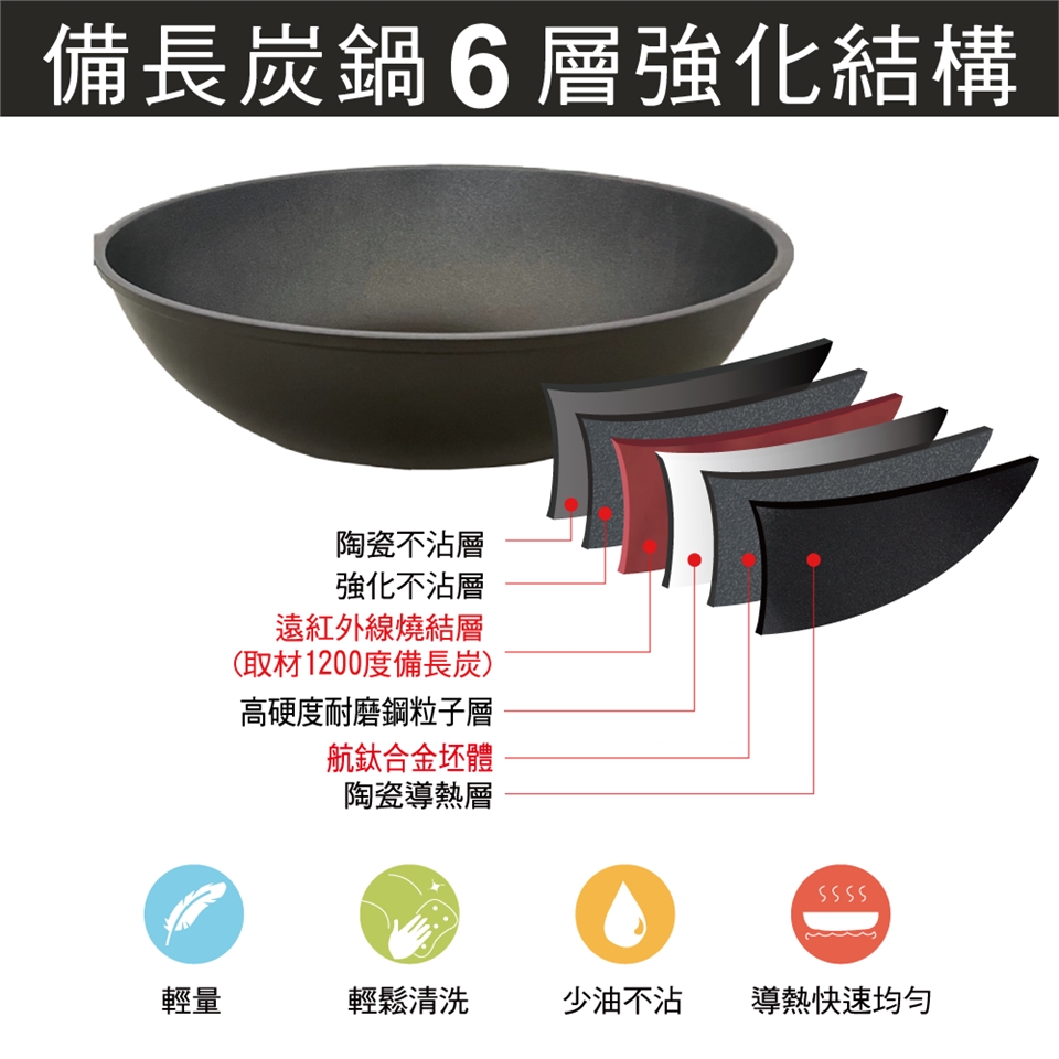 • 材質:備長炭遠紅外線元素多層複合金強化處理、航鈦合金、不銹鋼強化玻璃鍋蓋