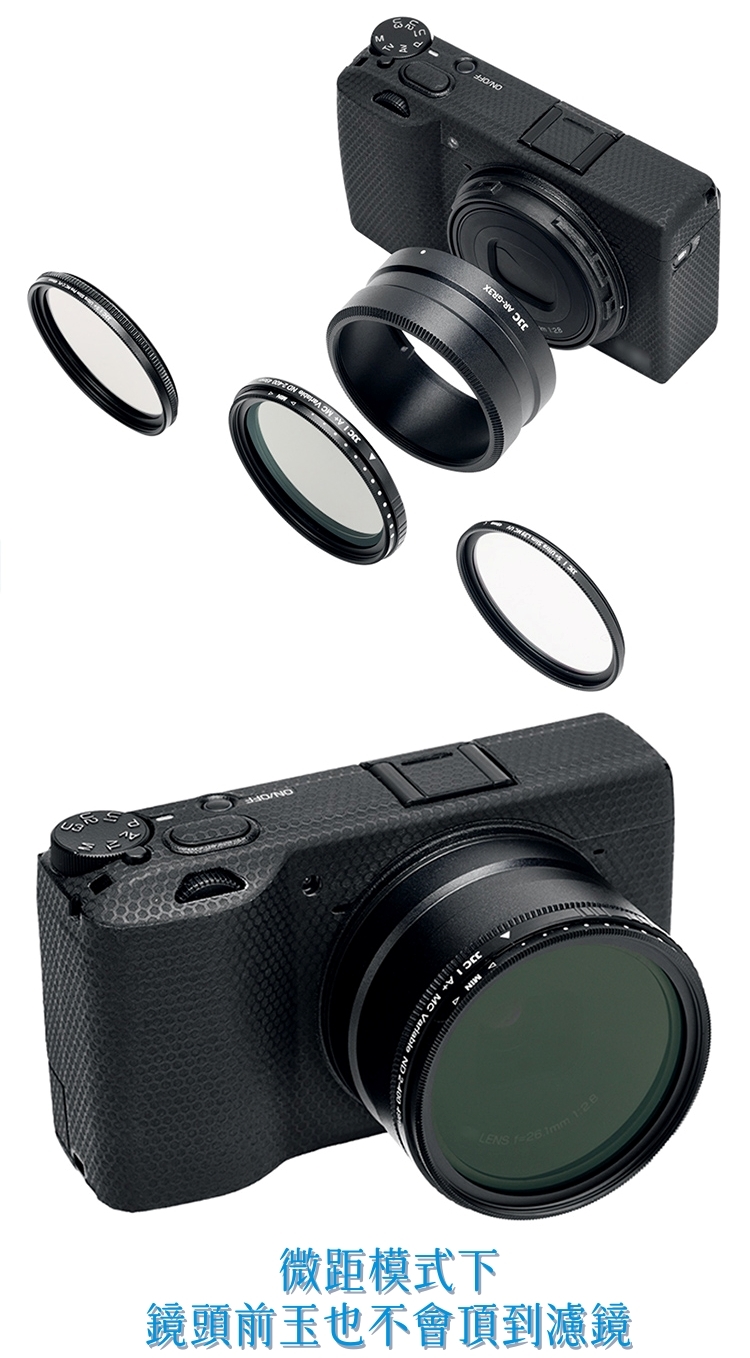 ●如有需要搭配使用JJC的LC-GR3鏡頭蓋,請有安裝的濾鏡厚度不可超過4.5mm。