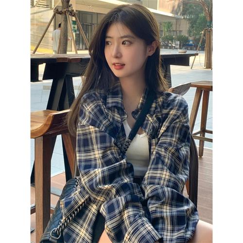 韓版冪式穿搭格子襯衫女大碼慵懶復古寬松襯衣薄款外套長袖上衣春