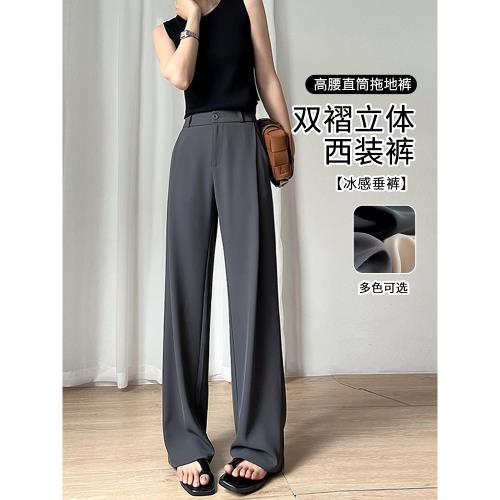 灰色西裝褲女夏季薄款高腰顯瘦垂感直筒寬松休閑小個子拖地闊腿褲