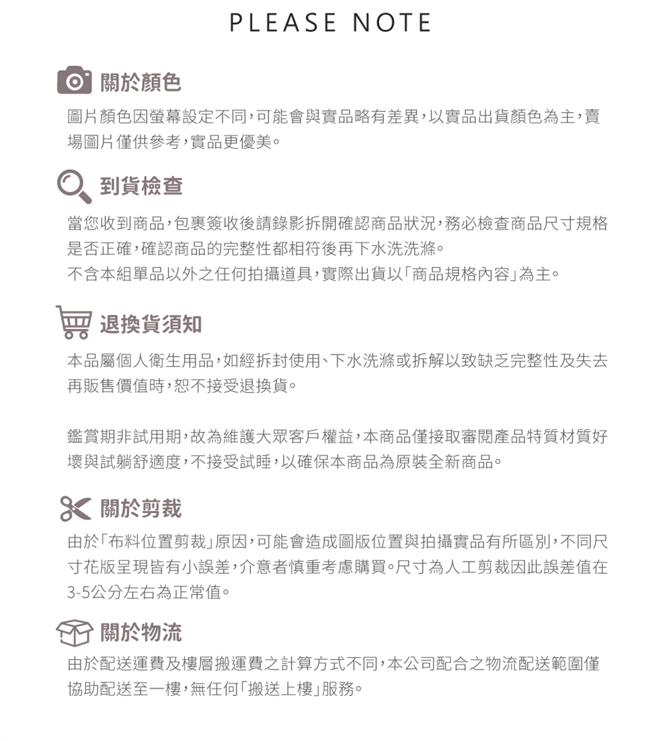 ※如商品因試睡、洗滌等等...產生異味與明顯使用痕跡 恕不接受退換貨。