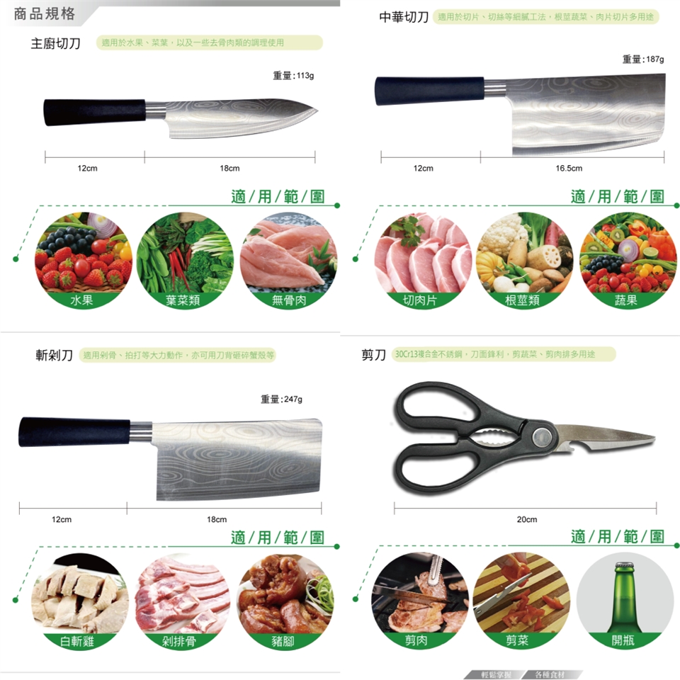 • 重量:主廚切刀-113g/中華切刀-187g/斬剁刀-247g/料理剪刀-76g