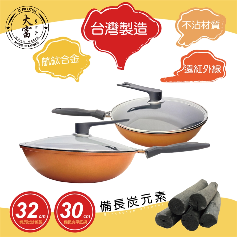 本產品組合:台灣製造 大富鍋 遠紅外線 備長炭 6層專利炒菜鍋彩金豪華款(32cm深炒鍋+30cm平底鍋)送420不鏽鋼 廚房刀具四件式-鹼性水能量不沾鍋