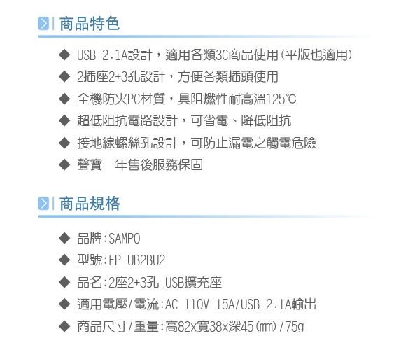 【SAMPO 聲寶】2座2+3孔單USB擴充插座 (USB 2.1A快速充電) EP-UB2BU2