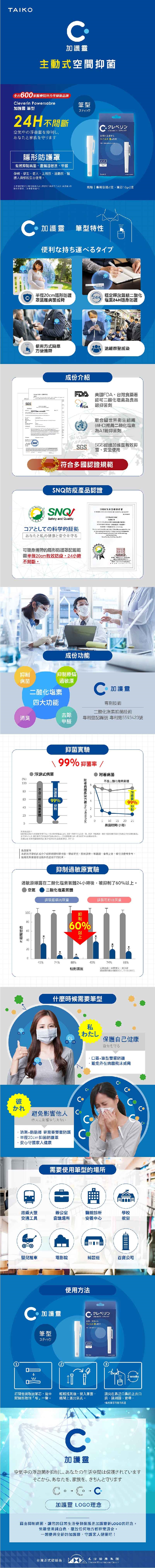 •專利技術設計、穩定釋放低濃度二酸化鹽素分子,直接置於室內空間,能有效抑制空間中細菌、真菌、異味、甲醛、過敏原(塵蟎碎片)等懸浮有害物質