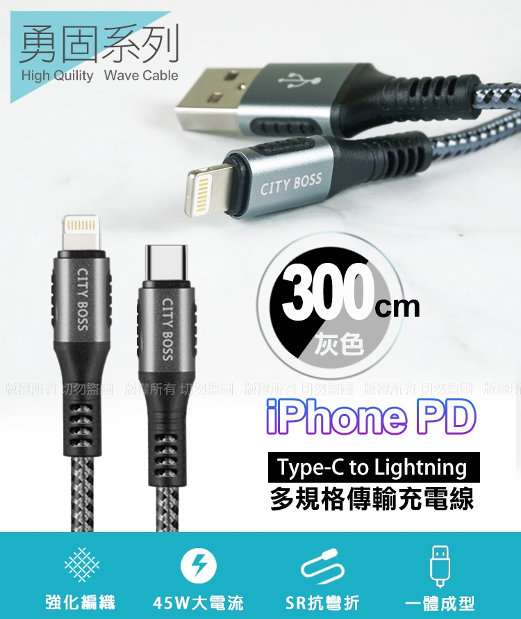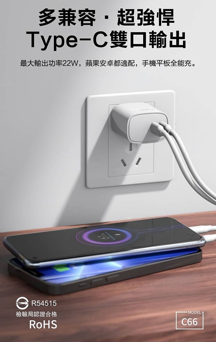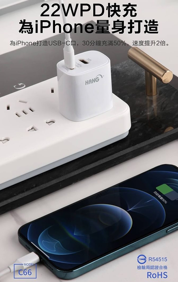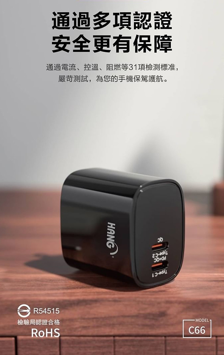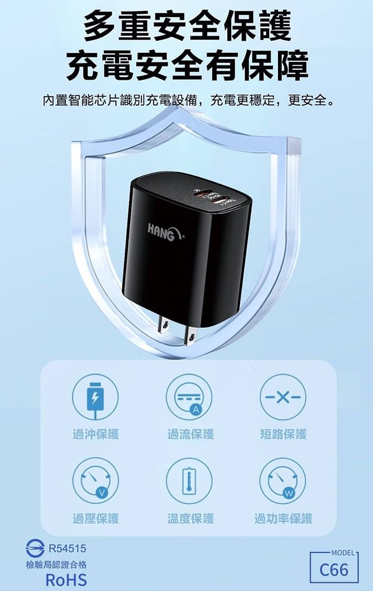 HANG C66 PD+QC快充 雙Type C 充電頭-白色+勇固 Type-C to Lightning PD耐彎折快充線3米