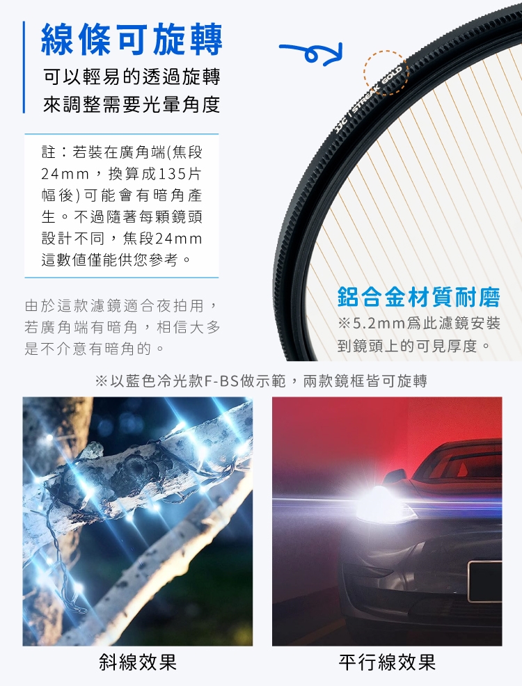 ●可旋轉的前框(厚5.2mm的鋁合金製外框,可有效保護鏡頭),可以輕易的呈現您要的光暈角度。