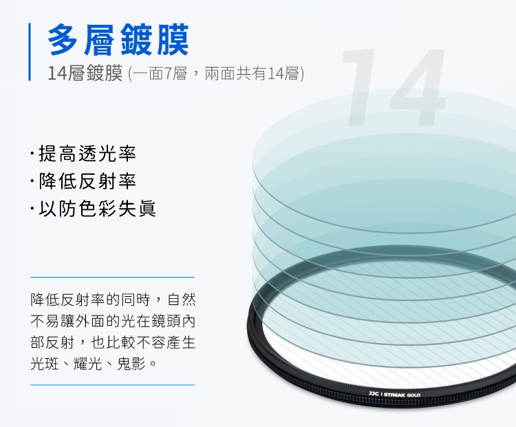 ※表面有鍍14層多層膜(一面7層,兩面共有14層),不易讓外面的光在鏡頭內部反射,因此減少光斑、耀光、鬼影的發生。