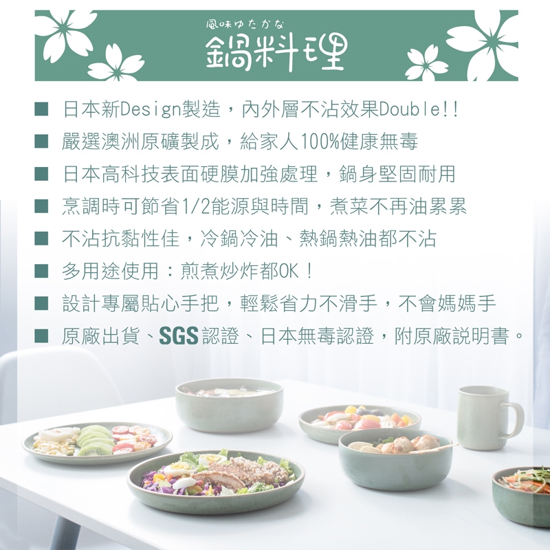 5. 日本專家設計.不沾性極佳.省油省時省油煙,耐磨性高,具有理想的不黏性能,煎雞蛋無須放油,少許油即可烹調美食。