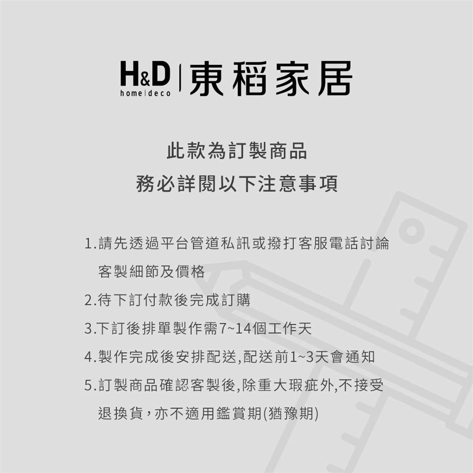 (1) 配送時間:大型家俱配送不易,配送時間約7至14個工作天(不含假日),送貨前物流公司將會與你確認送貨時間,星期日及國定假日皆無配送。