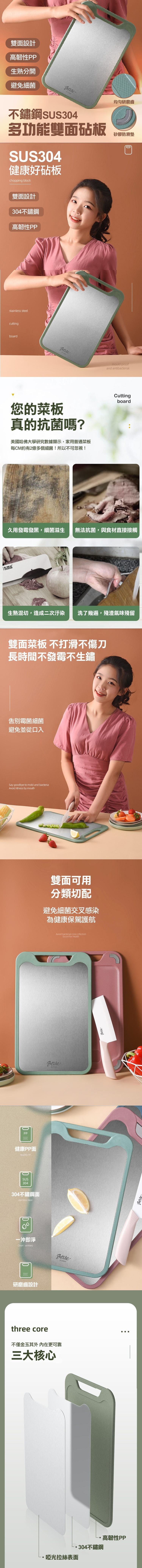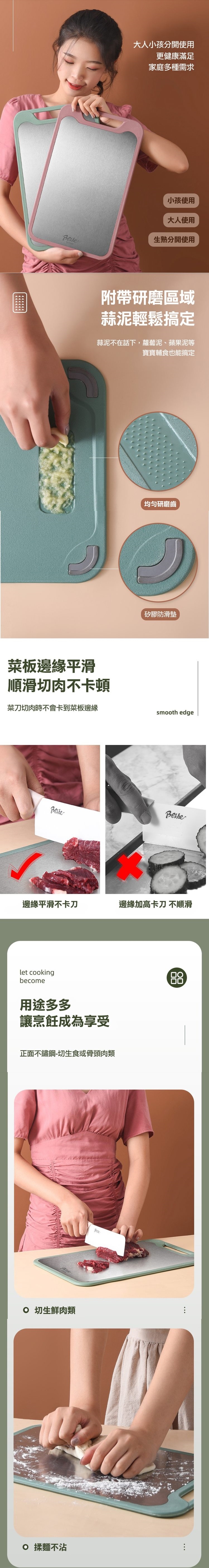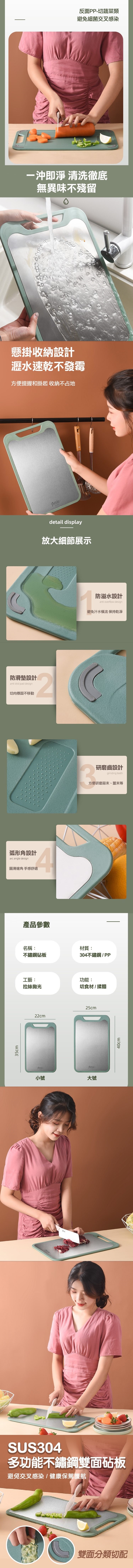 304不鏽鋼雙面皆可用,生食蔬果可分開好衛生,研磨區域能製做蒜泥、蘋果泥等,菜板邊緣平滑,切肉時不卡菜板邊緣,加厚邊框,防溢水設計,保持乾淨,防滑矽膠墊,穩固不移動,可懸掛收納設計,通風瀝水,握把可提可掛好收納