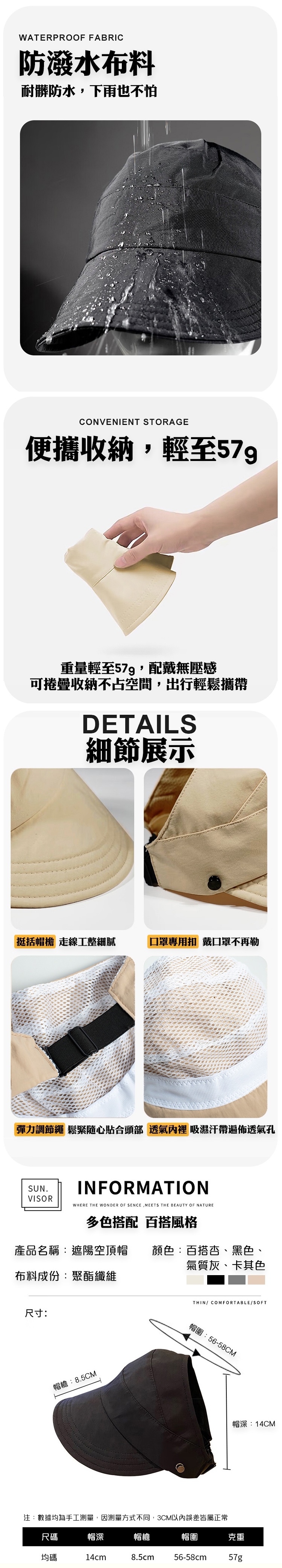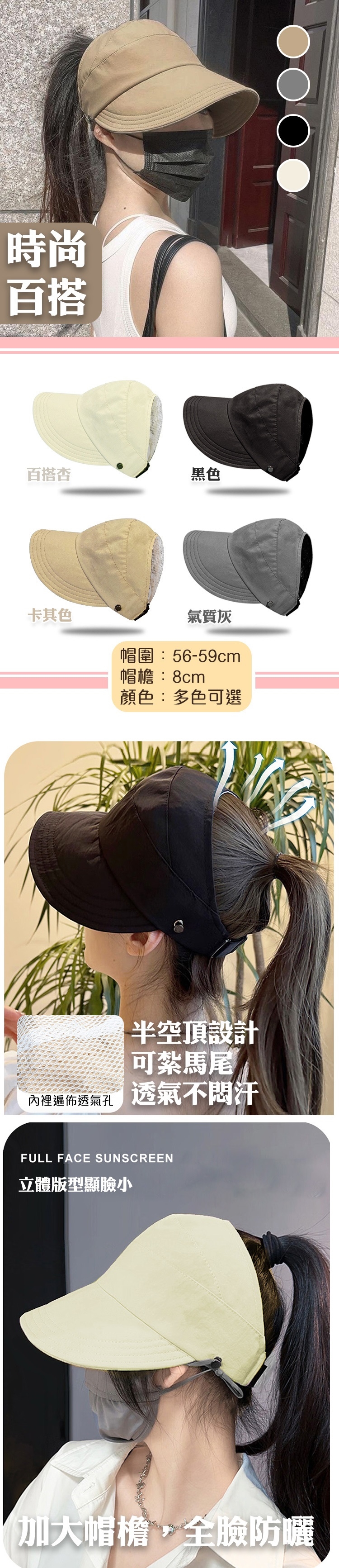 商品名稱:網紅百搭輕薄防潑水小臉防曬空頂遮陽帽-H 不易掉落可紮馬尾掛口罩