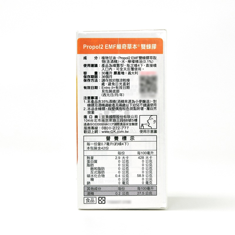 內容物名稱:植物甘油、Propol2 EMF雙蜂膠萃取物(含酒精)、水...等詳見外包裝標示