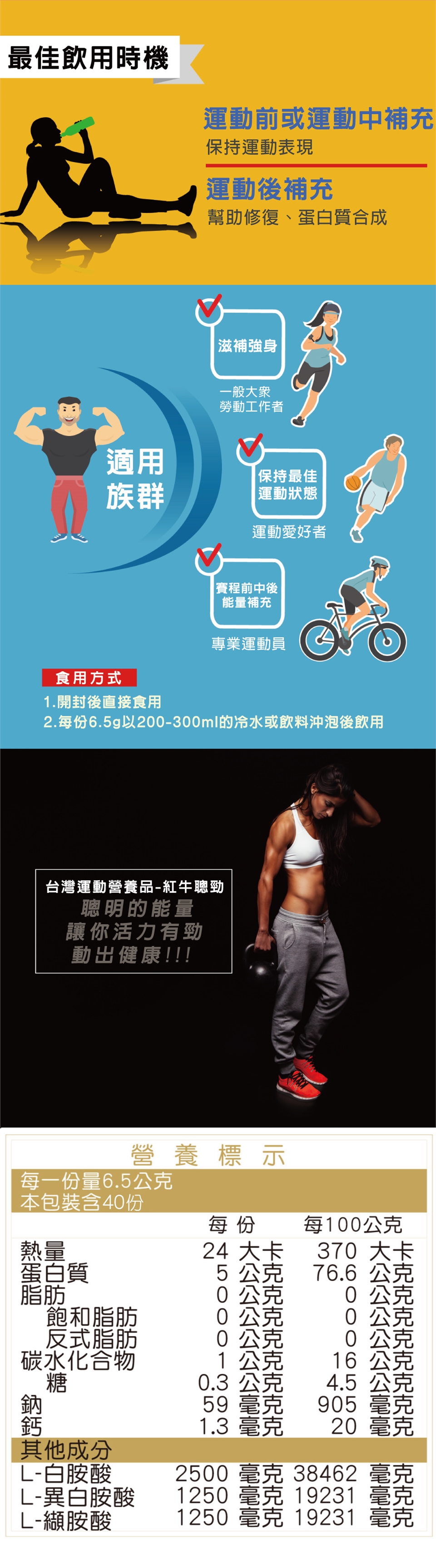 每日2-4次,每次一份6.5公克紅牛聰勁即溶BCAA,以200-300ml冷水或飲料沖泡後飲用,或直接食用。
