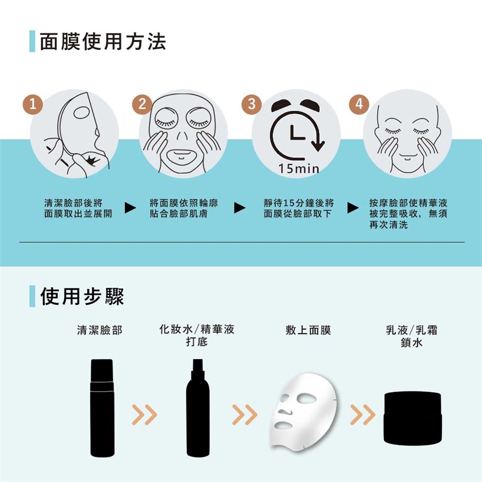 使用方式:徹底潔面後取面膜撕開鋁箔,將面膜完全服貼於臉上,5-15分鐘完全吸收取下即可,皮膚較乾或敏感時,請先敷3-5分鐘後,皮膚適應後慢慢增加時間
