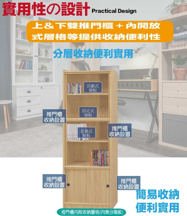 採用推門櫃+內開放多層格等收納空間設計