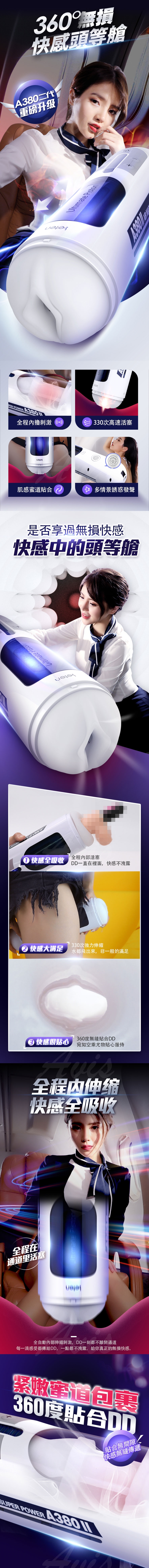 A380二代性愛頭等艙重磅再升級,一分鐘330次活塞上位,讓您享受空姐坐在您身上賣力搖擺的快感。緊嫩蜜道由上百顆蜜芽紋理組成的迷情通道緊緊吸附著您,彷彿進了極樂空間。擁有智能發聲功能,給您親臨現場的快感體驗來自雲尖上的誘惑。