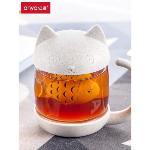 安雅可愛貓咪玻璃水杯子卡通馬克杯帶蓋少女網紅花茶杯過濾泡茶杯