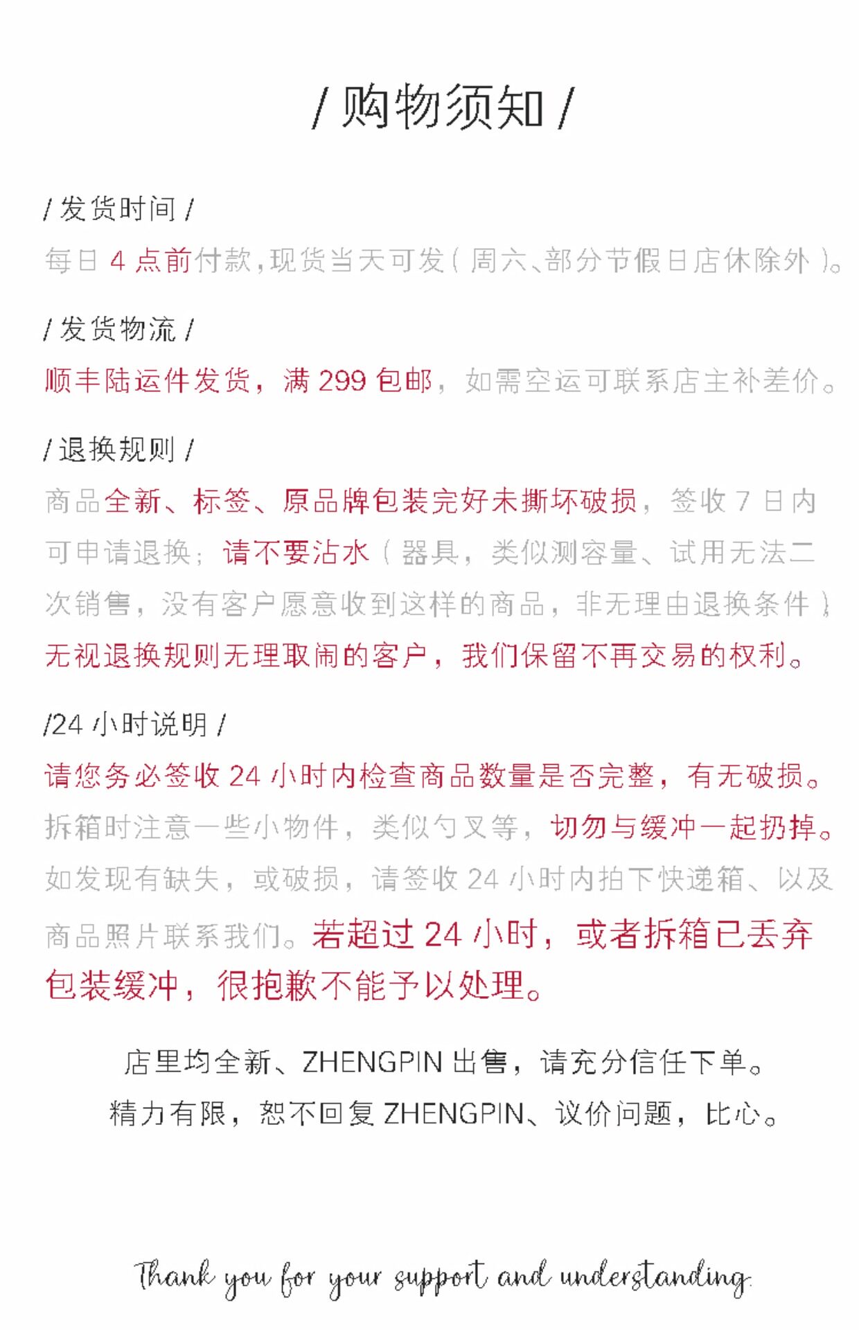 如因不可抗力因素導致商品缺貨或廠商無法出貨,本店保有取消訂單的權利。若訂單部分商品缺貨,由於代購模式採不同廠商個別出貨,部分缺貨無法取消整筆訂單,敬請見諒,商家將為缺貨部分辦理退款處理。無法受理因缺貨要求取消整筆訂單。 - 配送時間與緊急需求