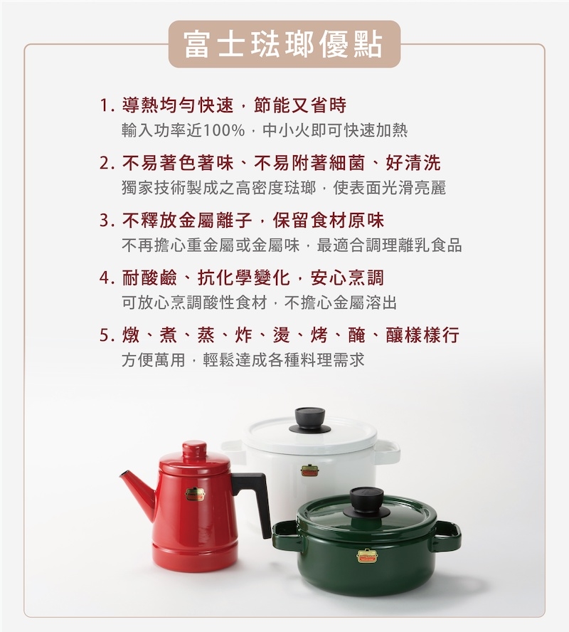 琺瑯產品適用各種直火爐具,包含瓦斯爐、IH電磁爐、電熱爐、黑晶爐、電陶爐、紅外線爐等(IH電磁爐感應線圈尺寸不一,購買前請先確認府上 IH電磁爐感應尺寸)
