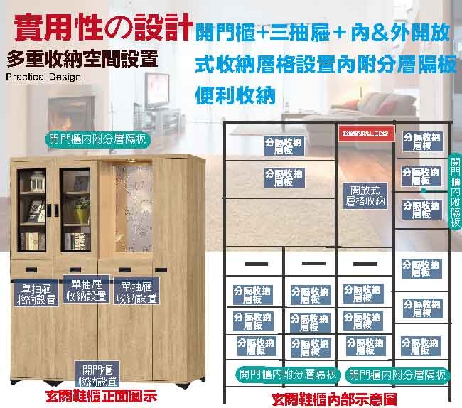 採用開門櫃+三抽屜+內&外開放層格+LED玄關燈設置等收納空間設計