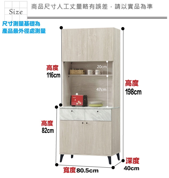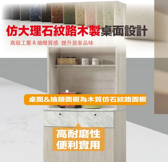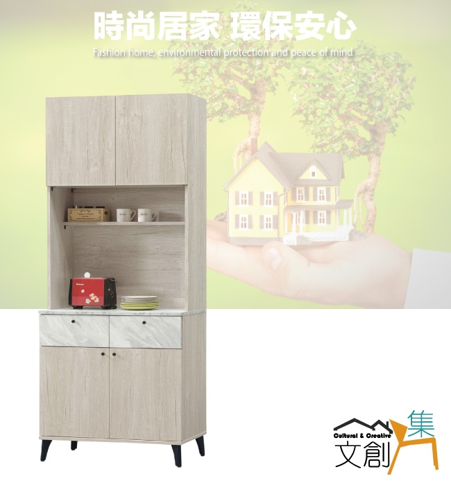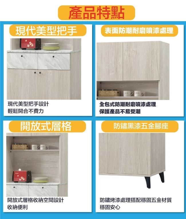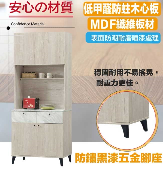 【文創集】邁樂卡2.7尺四門二抽高餐櫃組合(仿雲紋石紋木質桌面板) 木紋雙色系+現代簡約風格+安心材質製造,使用放心+搭配居家更便利,整體採用防蛀木心板+防鏽黑漆五金腳座+五金滑軌結構+仿雲紋石紋木質桌面板(防潮MDF纖維板)等材質搭配外層採用優莉坦耐磨全包式噴漆處理 ,採用開門櫃+二抽屜+內&外開放層格等收納空間設計,全由專人配送到家,專業安心服務,替你省下更多時間!