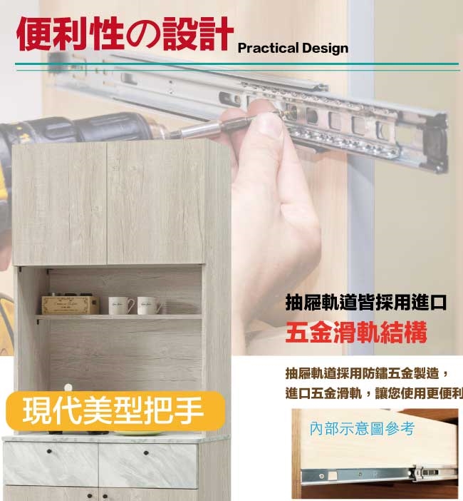採用開門櫃+二抽屜+內&外開放層格等收納空間設計