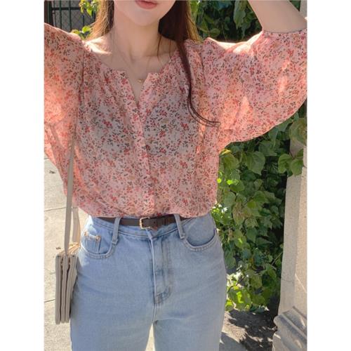 防曬襯衫夏季2023新款甜美薄款襯衣溫柔風寬松氣質碎花雪紡女上衣