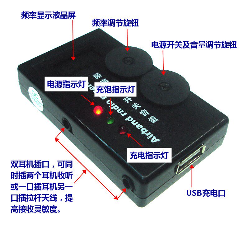 注:本接收機為機場地勤工作人員接收機,用于接收機場塔臺和飛機間的指揮通話,需靠近機場才能收到信號,實際接收距離每個地區各不相同,建議實測。沒靠近機場又想收到信號的請別拍!有的機場甚至有可能收不到信號,介意者別拍!