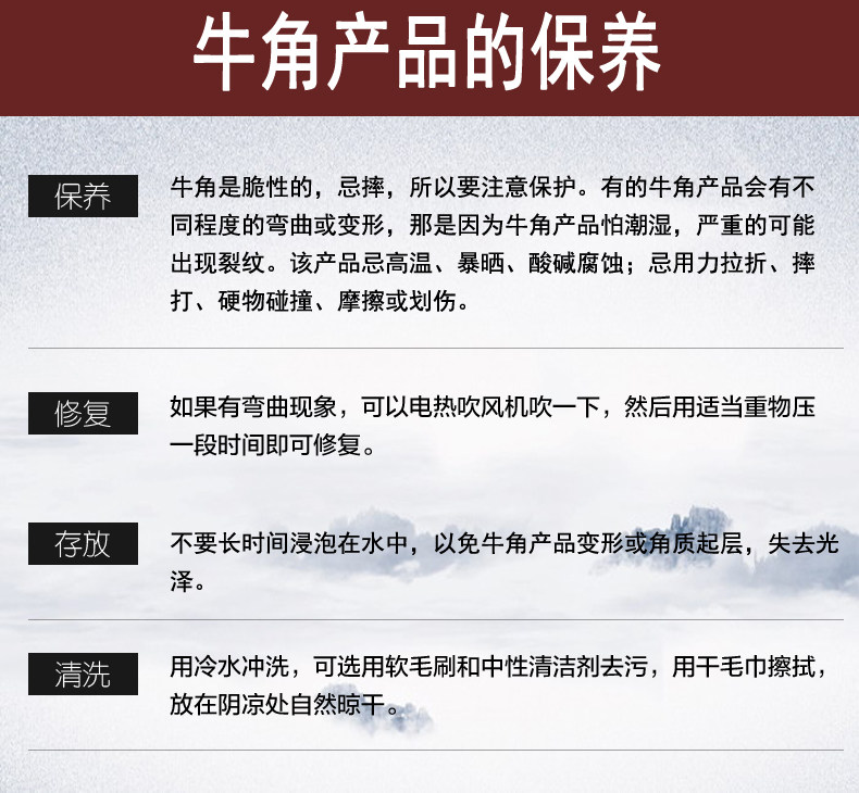 可用橄欖油、護手霜等滋潤的產品涂抹,不用的時候放入布袋內并存放于柜子。不要放在洗手間、暖氣出口和通風處等。切記不能碰熱水,否則會開裂變形