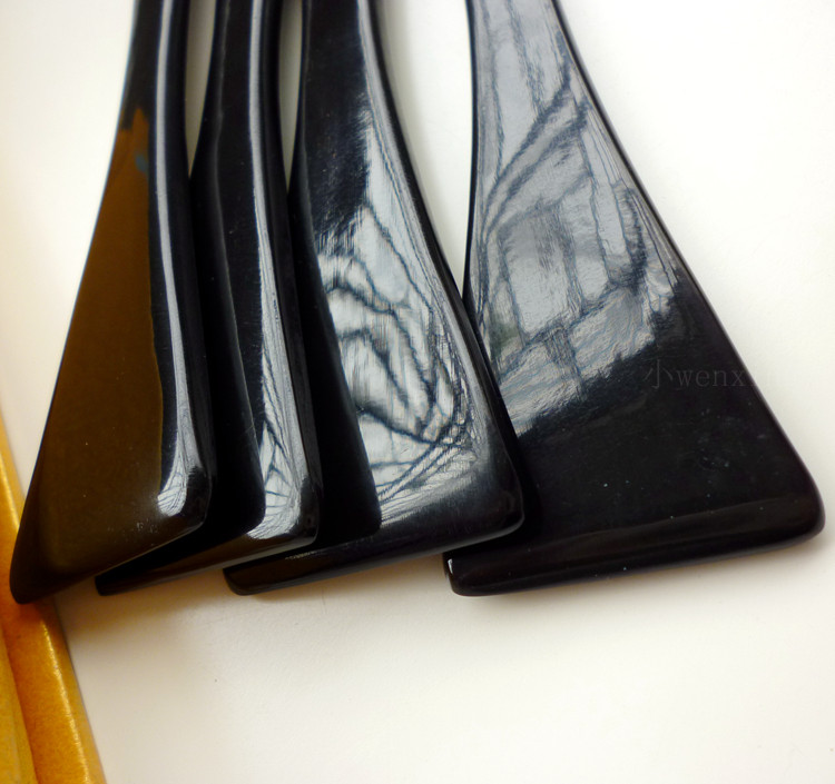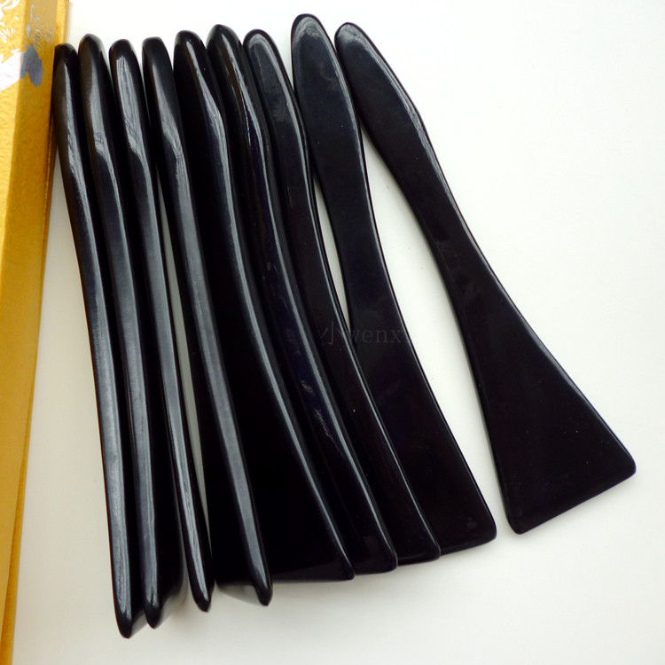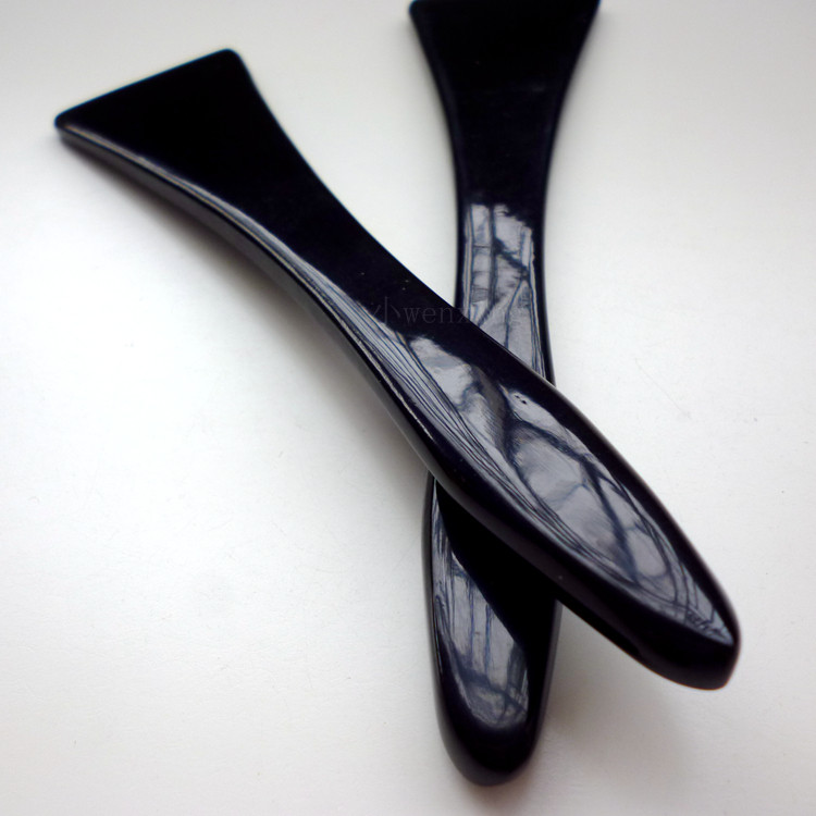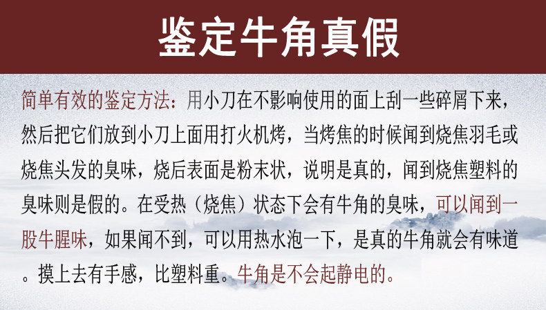 鑒別方法:用小刀在刮痧板上刮一些碎屑下來,然后把它們放到小刀上面用打火機烤,當烤焦的時候聞到燒焦羽毛或燒焦頭發的臭味,說明是真的;聞到燒焦塑料的臭味則是假的。