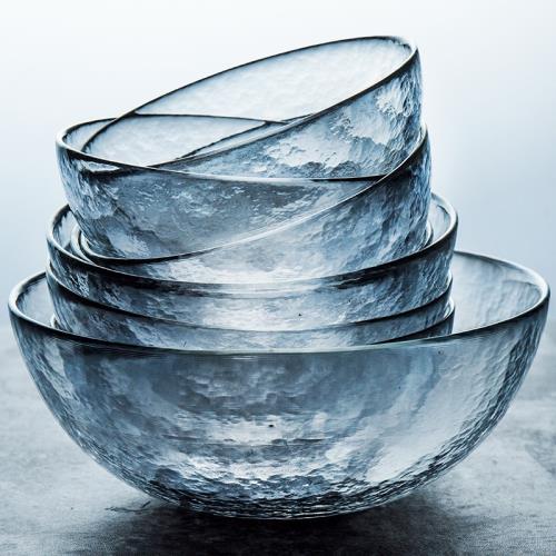家用大碗大號耐熱玻璃水果玻璃碗沙拉碗冷面碗捶紋日式透明甜品碗