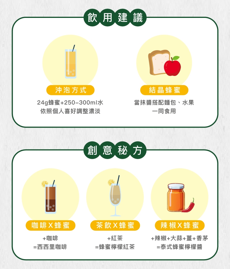 ※ 蜂蜜結晶屬自然現象,如遇結晶,建議直接使用湯匙取用或作為抹醬使用。