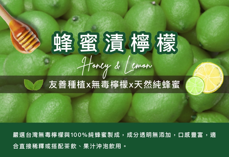 ・嚴選台灣無毒檸檬與100%純蜂蜜製成,吃得到天然果肉,口感豐富,適合直接稀釋或搭配茶飲、果汁沖泡飲用。