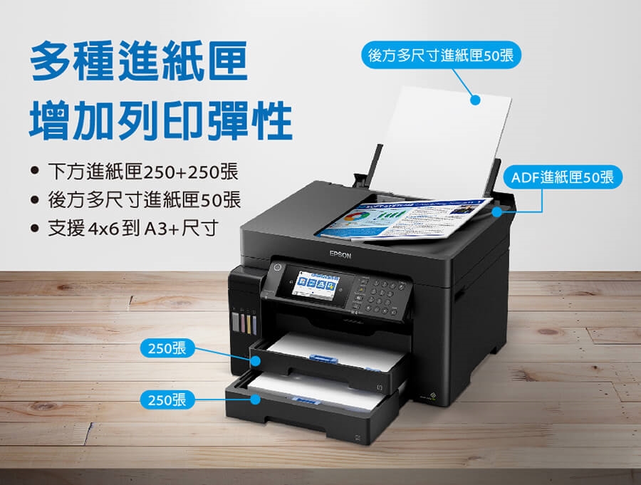 *前方進紙槽(250+250張)+後方(50張)+自動進紙器+(50張)