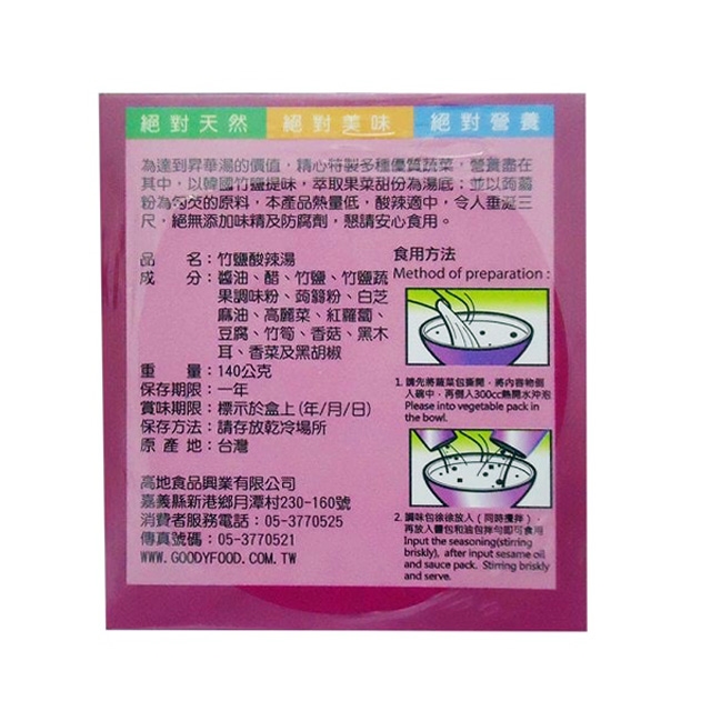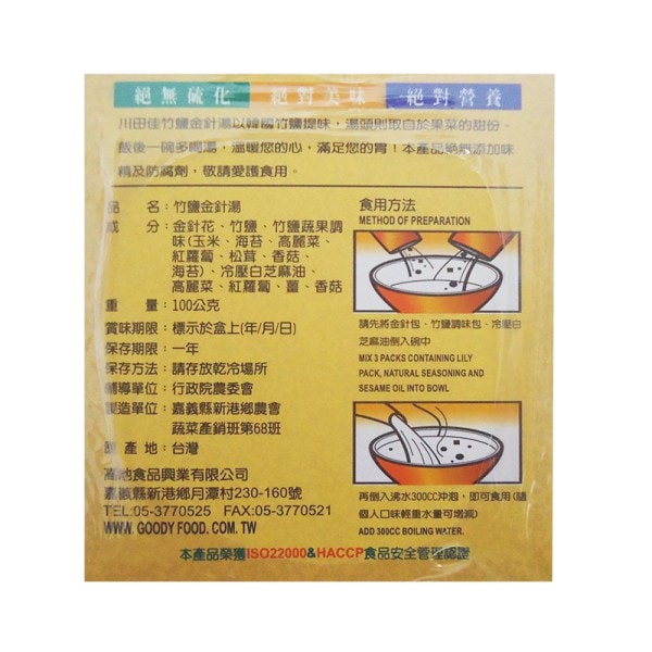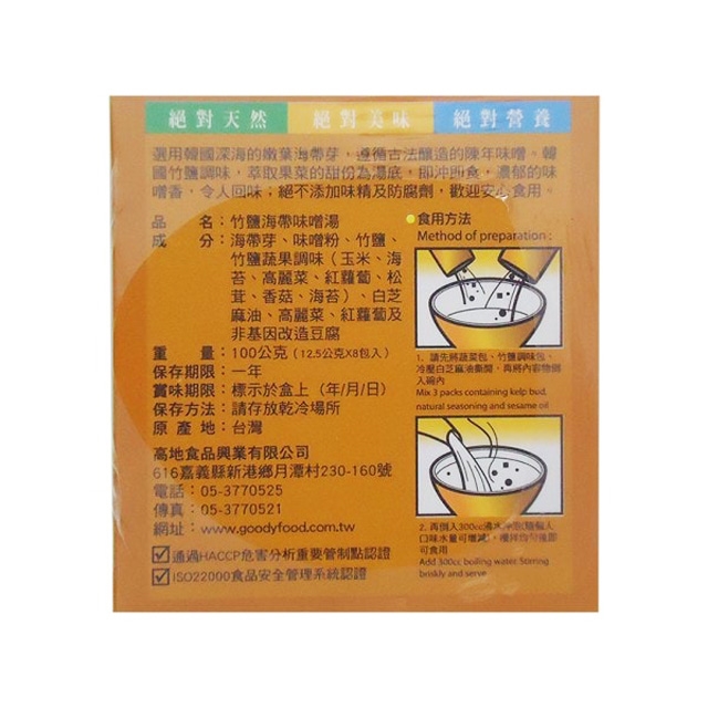 不經硫化,絕不漂白,搭配韓國竹鹽及蔬菜萃取物的竹鹽蔬果調味料,再以冷壓製法性溫而不烈燥的白芝麻油添味,融合而成的即時享受沖泡湯。