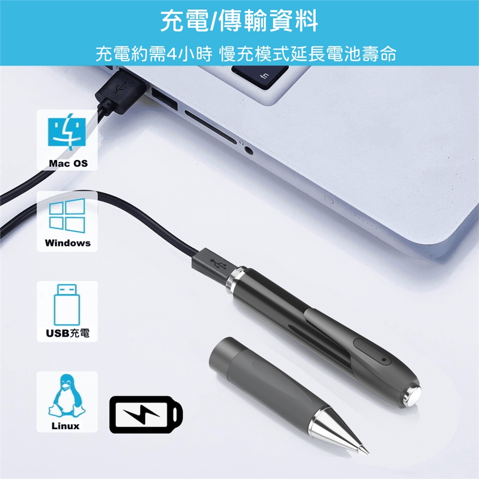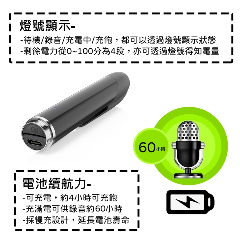 ⭐搭載獨家長效電池,充飽電後可連續錄音60小時(±10%)