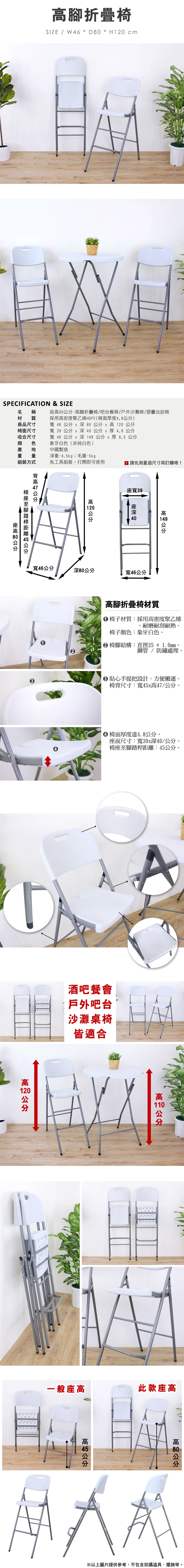 ◆座高80公分,椅面厚度4.8公分,深80公分x寬46公分x高120/公分,塑鋼吧台折疊椅、高腳洽談椅、戶外沙灘椅。
