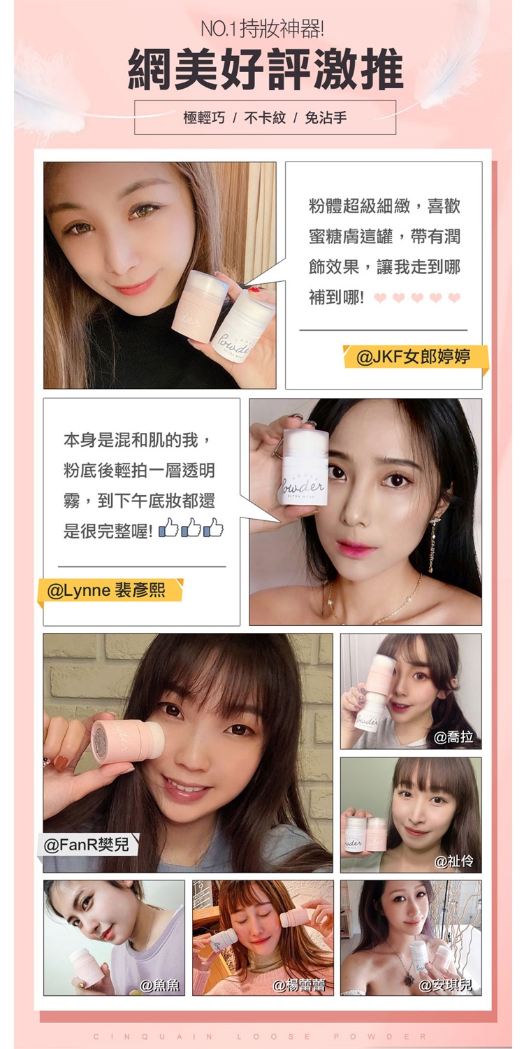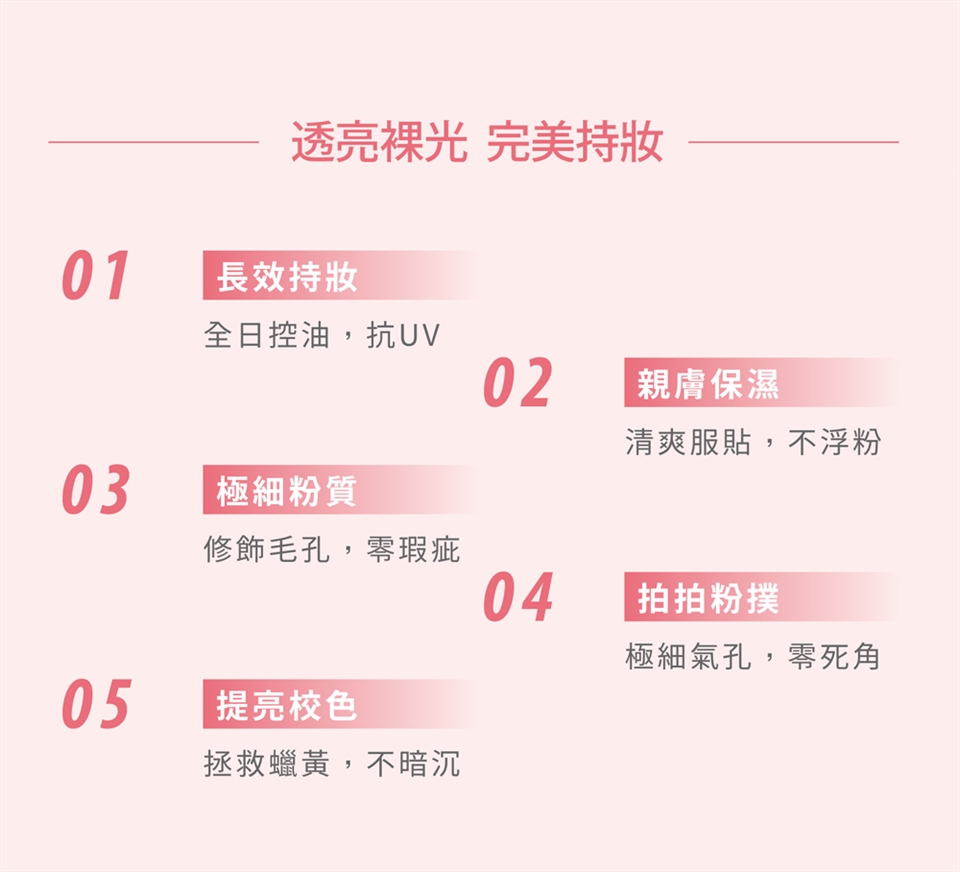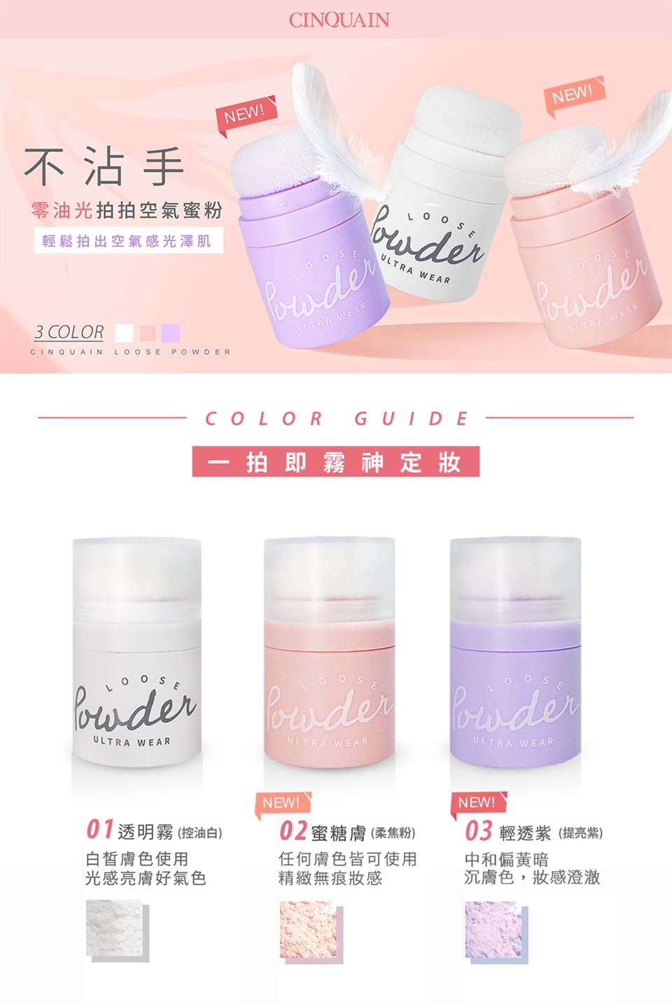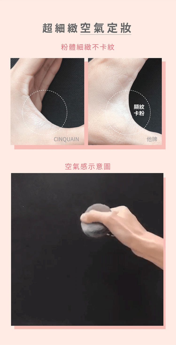 零油光拍拍空氣蜜粉:於粉底、BB霜或素顏霜打底步驟後,定妝使用