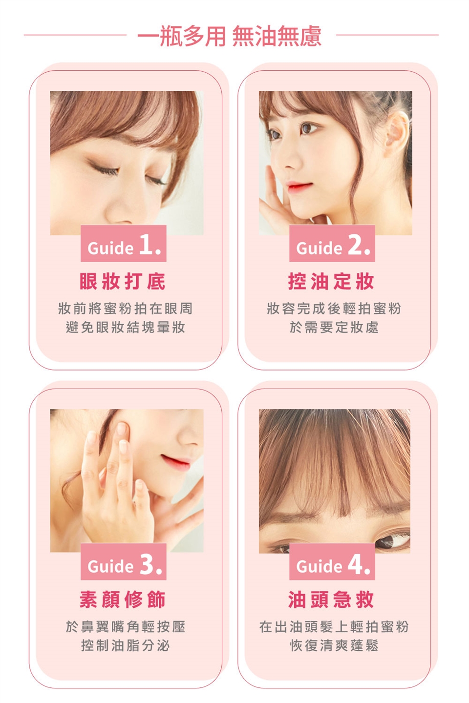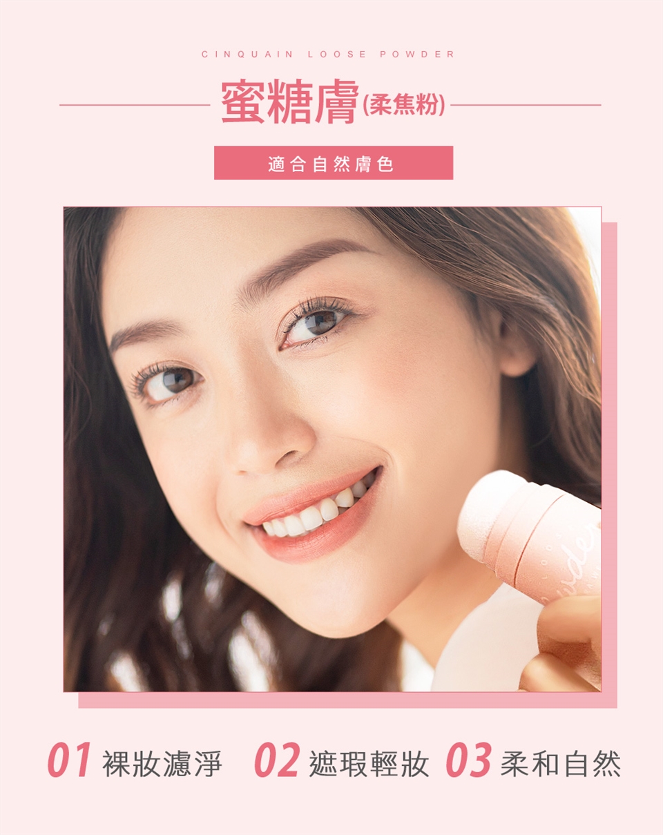 零油光拍拍空氣蜜粉:於粉底、BB霜或素顏霜打底步驟後,定妝使用