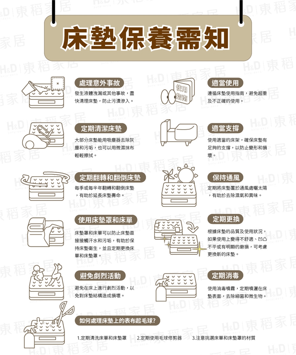 平時應套上床包或是保潔墊,避免髒汙滲透於床墊內。