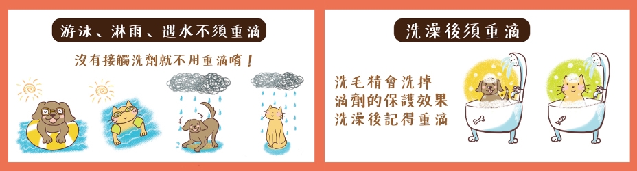 寵物暴露在雨中、游泳或清水沖到時,仍持續受保護,可不必重滴,所有寵物的皮膚均有油性,可促進產品的活性分子溶於油脂,並擴散在脂肪層,覆蓋寵物全身身體的表面上,保護寵物。洗澡後需重滴。