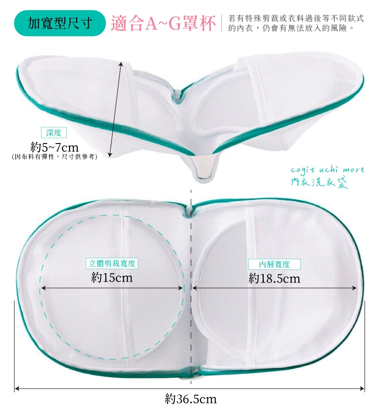 ●加寬型19 x 36.5 cm的尺寸,不但適合A~G罩杯,背心式內衣亦可放入。
