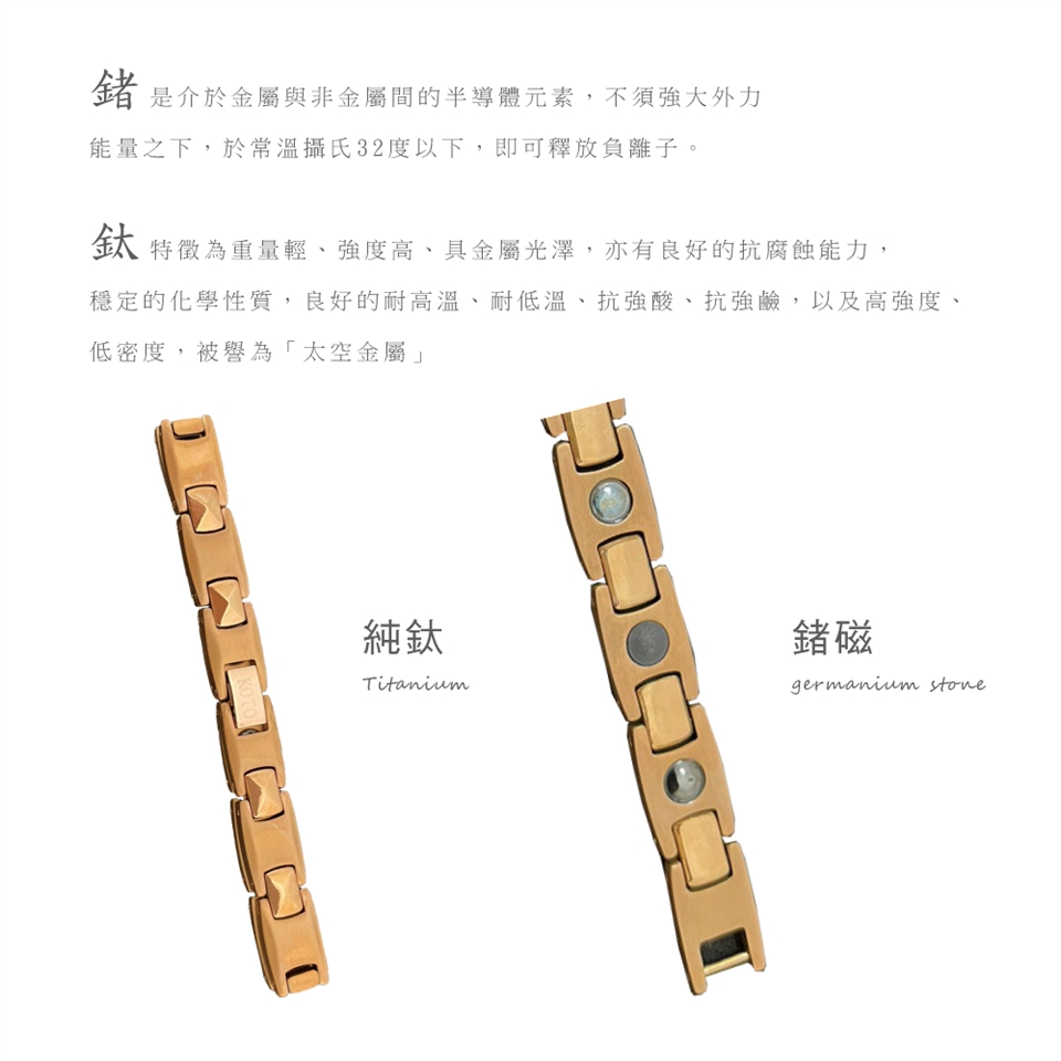 鍊身主要是太空金屬純鈦材質, 所以本身非常的輕, 適合年輕族群或媽媽族群, 不想手上負擔太重, 重量只有22g, 大約3個10元硬幣的重量而已, 質輕而亮澤, 大方貴氣, 而鍊身背面有磁石和鍺石, 對於身體能量有幫助流暢帶動氣場, 配戴起來身輕氣足更有活力! 佛要金裝, 人要衣裝, 配戴高品質鍺磁亮澤鈦手鍊飾品, 是非常棒的選擇!!