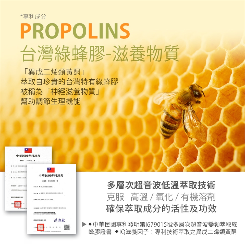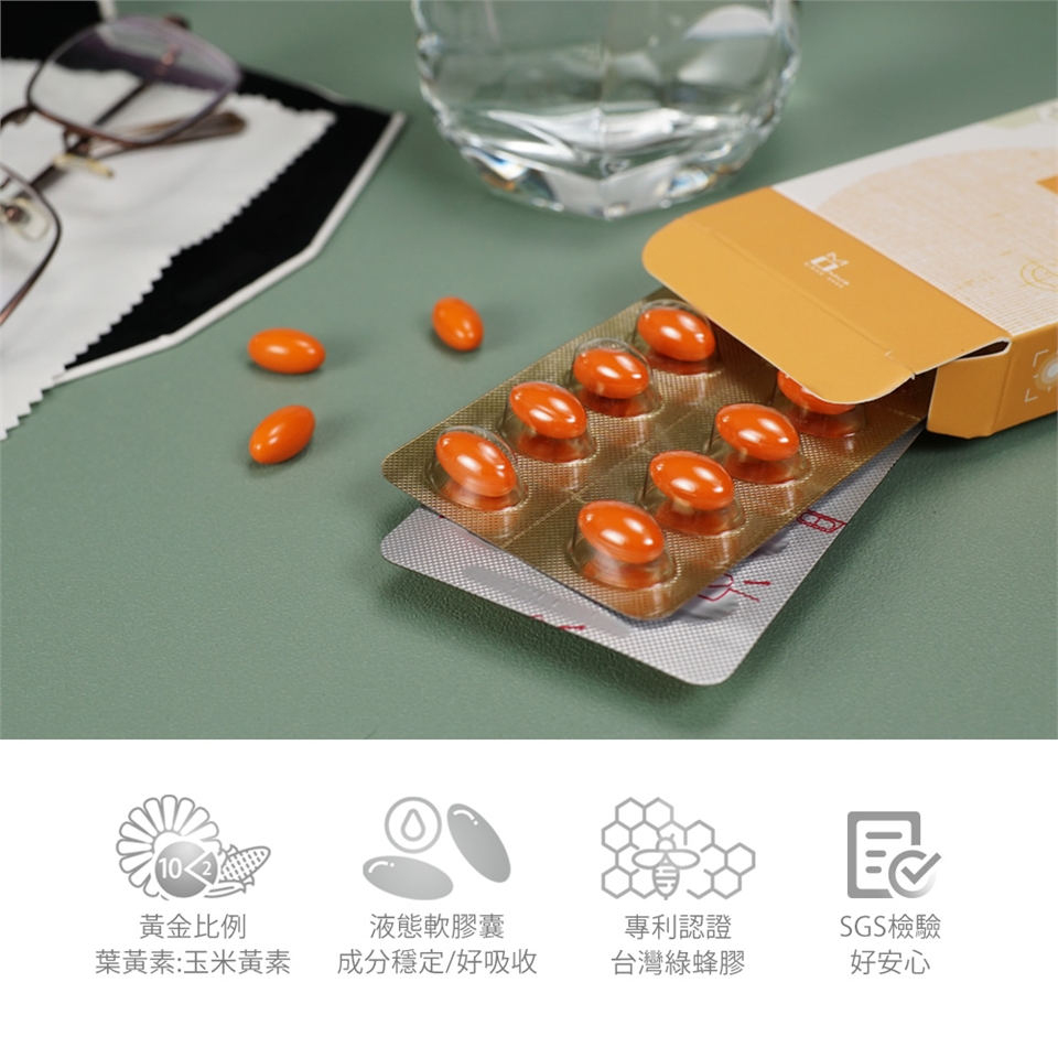 亞麻子油/金盞花萃取物 (含游離型葉黃素)/枸杞萃取物/鋅酵母10%/天然啤酒酵母B群/綠蜂膠萃取物/山桑子萃取粉/藻類DHA/油狀胡蘿蔔素/維生素E(抗氧化劑).