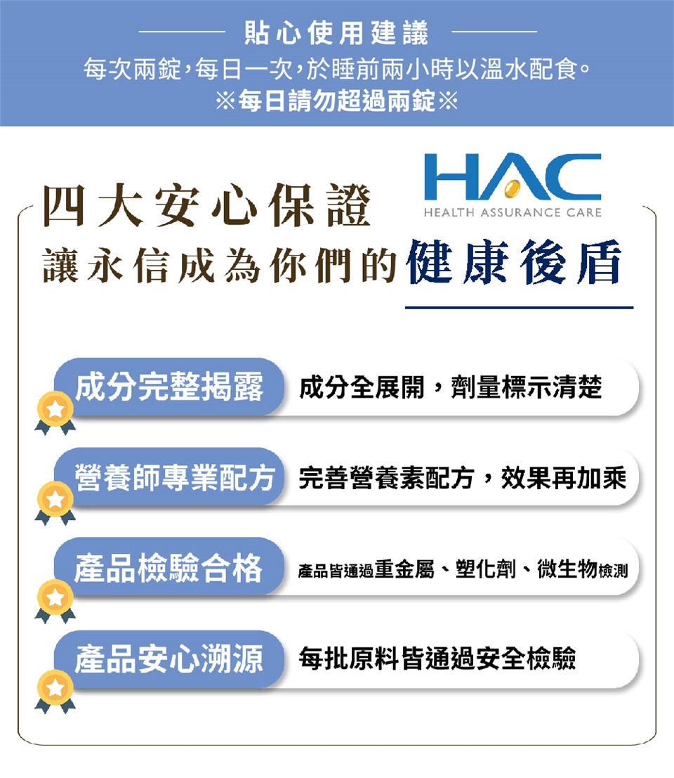 每日2錠,於睡前2小時以溫水配食。