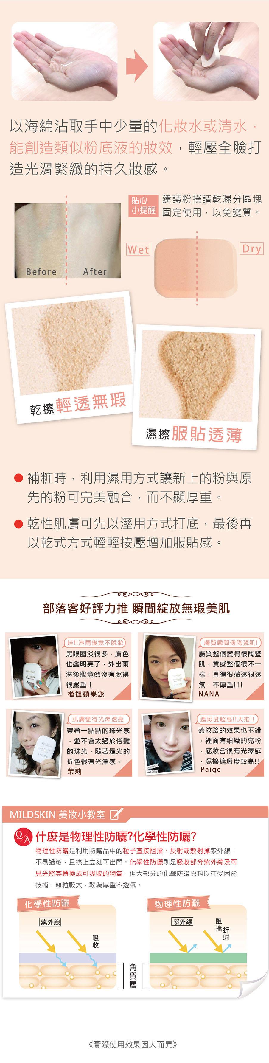 以海綿粉撲沾取適量推勻於臉部,可在需要遮瑕處重複輕輕按壓即可。